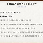 준비 [교사 준비물] 1. 2. [학생 준비물]1.2. 처음 만나는 모둠놀이 1. 4월을 맞아 새로운 모둠을 구성했다. (1) 공평한 모둠 방법을 활용, 중간에 진통도 있었지만 잘 이겨냈다. - http://akmassam.tistory.com/107 - 모둠을 만들때 반드시 인원수와 성별을 정확히 인지시켜주자. 2. 처음 만나는 모둠을 위한 놀이 모음 (1) 하이파이브 하기 서로 호흡을 맞추어 가장 큰 소리 내어보기 (2) 모둠 내에서 찾기 놀이 : 친구들의 소지품도 정리하고, 서로의 친밀감을 높이는 놀이 - 가장 큰, 작은, 긴, 짧은 등 다양한 친구들의 개성을 활용할 수 있는 놀이 - 학생들의 의견을 받아 우리모둠은 이게 최고다! 찾아오기 친구들 물건 중 가장 긴 물건 찾아오기 가장 발이 작은 친구..